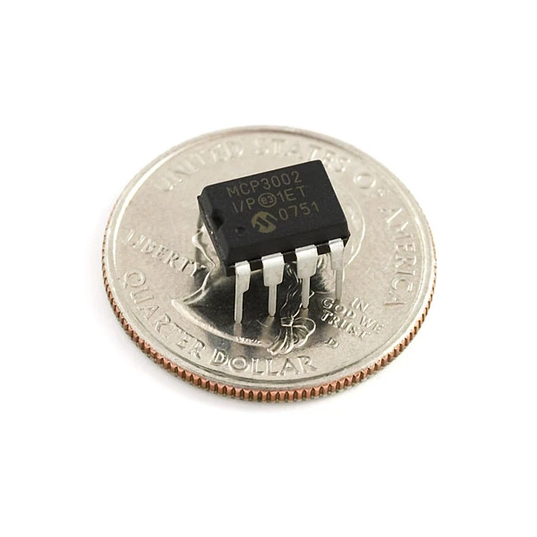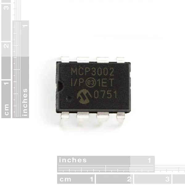The MCP3002 has a 10-bit analog to digital converter (ADC) with a simple to use SPI interface. Use this IC if your microcontroller does not have an ADC or have enough ADC lines. A great chip when you need to add additional ADC lines.