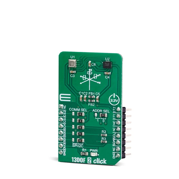 13DOF 2 Click is an advanced 13-axis motion tracking Click board™, which utilizes two different sensor ICs onboard: BME680, Volatile Organic Compounds (VOCs), humidity, pressure and temperature sensor and BMX160, a 9-axis sensor consisting of a 3-axis, low-g accelerometer, a low power 3-axis gyroscope and a 3-axis geomagnetic sensor. Both integrated sensor ICs are made by Bosch Sensortec, featuring the state-of-the-art sensor technology processes, in order to fulfill the requirements for immersive gaming and navigation applications, which require highly accurate sensor data fusion. Besides that, 13DOF 2 Click is also perfectly suited for use in many other applications such as mobile phones, tablet PCs, GPS systems, Smart watches, Sport and fitness devices, and many more.