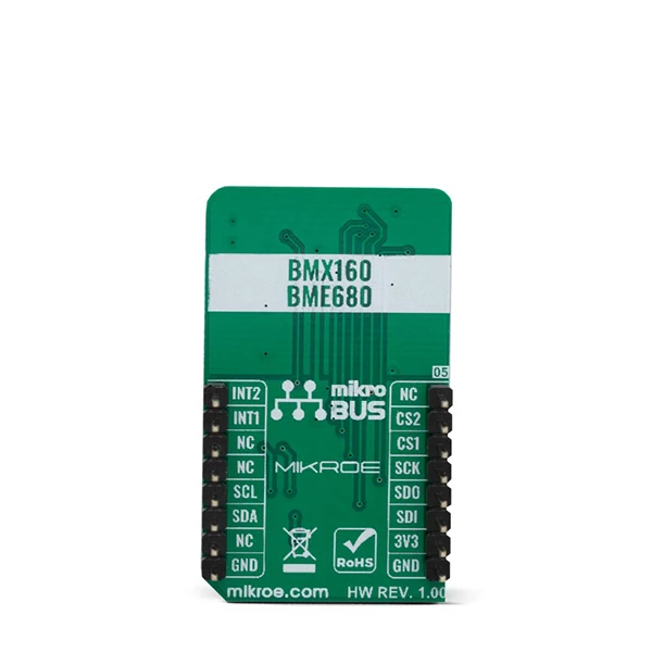 The BME680 is a digital 4-in-1 sensor with VOC, humidity, pressure and temperature measurement based on proven sensing principles, housed in an extremely compact metal-lid LGA package. Its small dimensions and its low power consumption enable the integration in battery-powered or frequency-coupled devices, such as handsets or wearables. The BMX160 is a highly integrated, low power 9-axis sensor that provides precise acceleration and angular rate (gyroscopic) and geomagnetic measurement in each spatial direction. It integrates the 16-bit digital, triaxial accelerometer, 16-bit digital, triaxial gyroscope, and a geomagnetic sensor. 13DOF 2 Click has these two ICs integrated onboard, which makes it a very powerful motion and sensing applications designing tool.