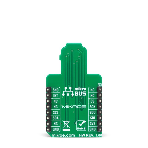 This Click Board™ includes a vibratory MEMS rate gyroscope that detects rotation about the X-, Y-, and Z- axes, and a 3-axis MEMS accelerometer. The full-scale range of the gyro sensors may be digitally programmed from ±15.625 up to ±2000 degrees per second (DPS). The ICM-42688-P architecture reduces the accelerometer’s sensitivity to fabrication variations as well as to thermal drift. When the device is placed on a flat surface, it will measure 0g on the X- and Y-axes and +1g on the Z-axis. The full-scale range of the digital output can be adjusted from ±2g, up to ±16g.