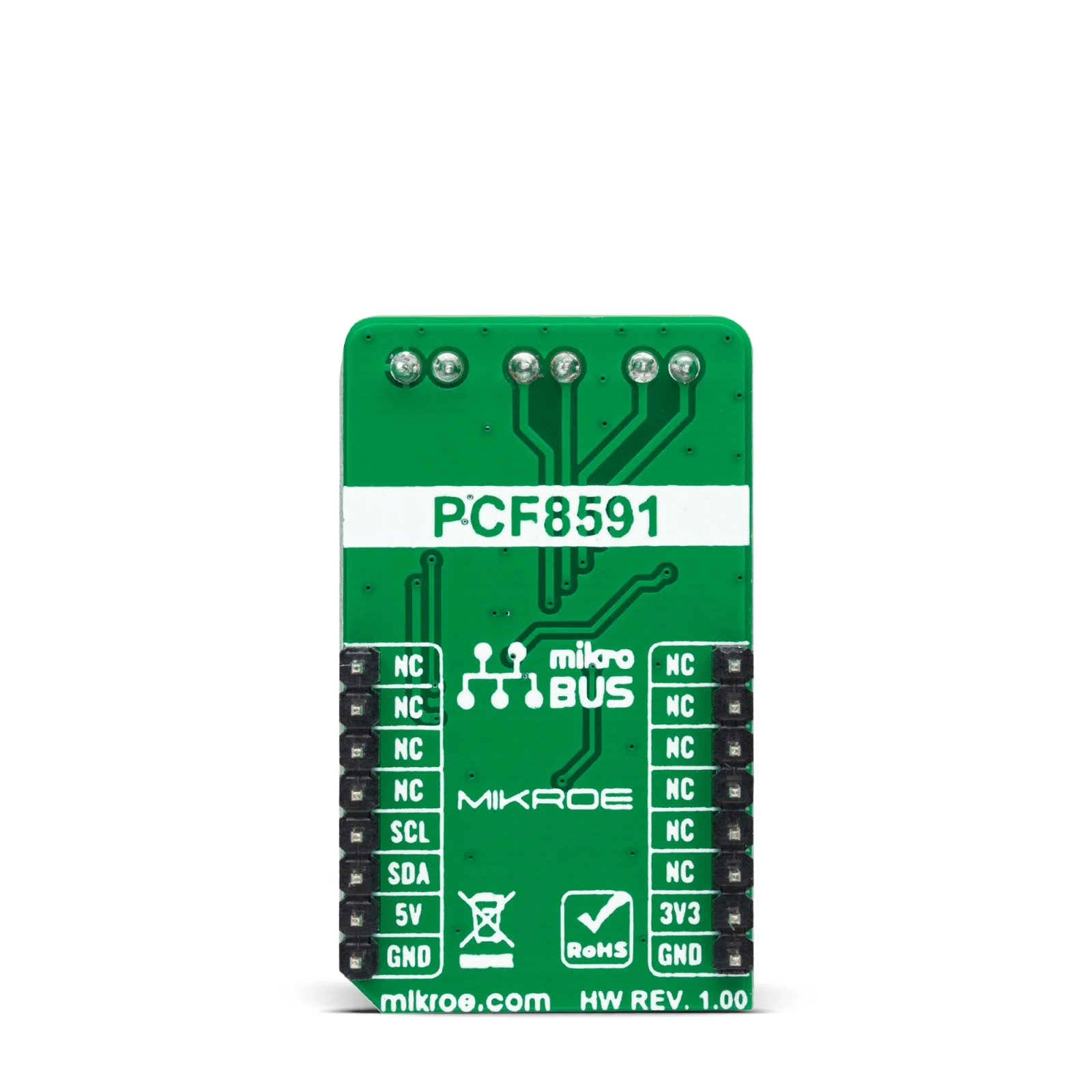 This Click board™ communicates with MCU using the standard I2C 2-Wire interface with a maximum clock frequency of 100kHz. The PCF8591 has a 7-bit peripheral address with the first four MSBs fixed to 1001. The address pins A0, A1, and A2, are programmed by the user and determine the value of the last three LSBs of the peripheral address, which can be selected by positioning onboard SMD jumpers labeled as ADDR SEL to an appropriate position marked as 0 or 1.