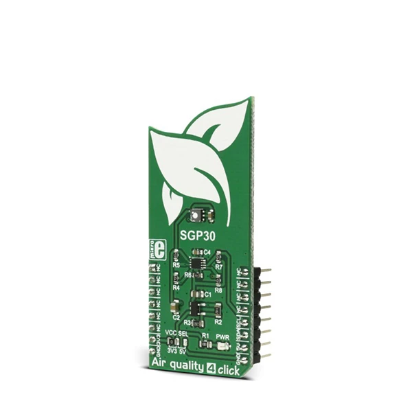 MIKROE Air quality 4 Click is an advanced air quality sensing device that combines multiple metal-oxide sensing elements on a chip to provide detailed information of the air quality parameters. This click can output a TVOC value readings as well as the CO2 equivalent concentration readings in an indoor environment. Besides these compensated attributes, the click can also output raw values of H2 and Ethanol in the air, that can be used to calculate gas concentrations, relative to a reference concentration.