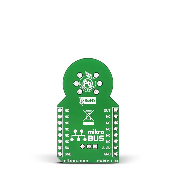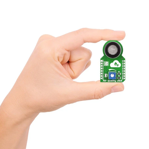 MIKROE Air Quality Click is a simple solution for adding a high sensitivity sensor for detecting a variety of gases that impact air quality in homes and offices. It carries an MQ-135 sensor. The Click is designed to run on a 5V power supply. It communicates with the target microcontroller over the AN pin on the mikroBUS™ line.