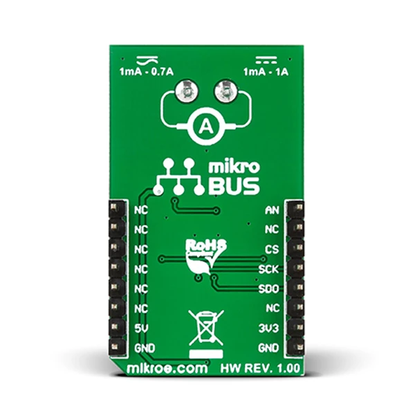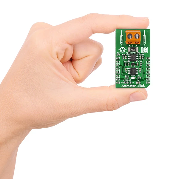Ammeter Click is a mikroBUS™ add-on board with circuitry for measuring electric current (both AC and DC).