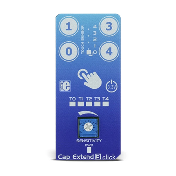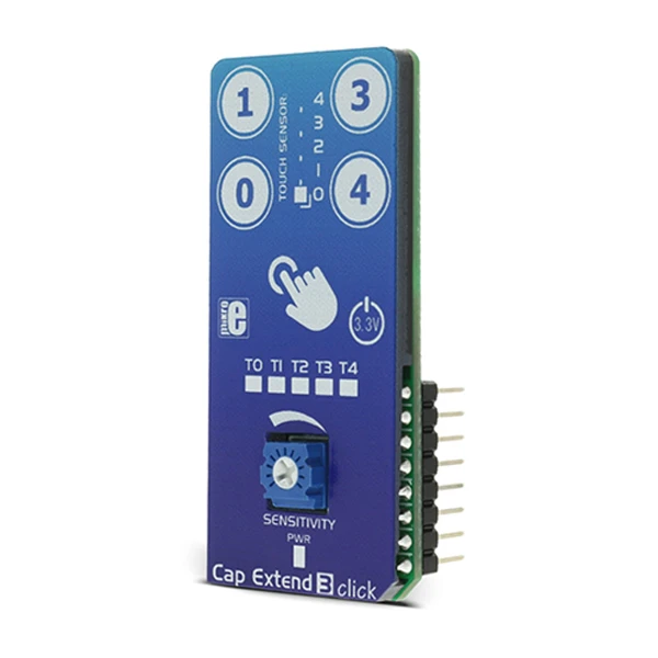Cap Extend 3 Click features four capacitive sensor pads integrated on the PCB, that can sense touch through a variety of different materials. This Click can sense touch through plastic, wood, or even metal, thanks to the proprietary Metal over Capacitive technology. All these materials can be used to protect the surface of the PCB and sensor pad traces, allowing implementation of all kinds of human-machine interfaces and seamless integration of the touch-sensitive buttons into various kinds of front panels. The Click also features a connector used for connecting to external sensors.