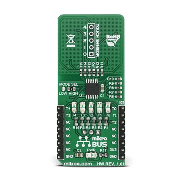 All the five channel output pins of the MTCH105 are routed to the mikroBUS™ so that their states can be read and detected by the MCU in an easy and simple way. The channels are routed to the AN, PWM, INT, RST and CS pins of the mikroBUS™.