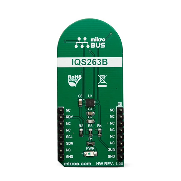 Although it looks simple at first glance, capacitive touch sensing is not an easy task. Many parameters need to be sampled, filtered, compared and processed before positive touch detection and its position are confirmed. To make this possible, Cap Wheel 2 Click utilizes the IQS263B, ProxSense® IC, a 3-channel projected (or self) capacitive proximity and touch controller from Azoteq. This IC has some advanced features such as the auto drift compensation, up to 80Hz report rate, long proximity range, automatic adjustment for optimal performance (ATI), configurable 8-bit 2/3 channel slider or 3 channel scroll wheel. These features enable CAP Wheel 2 Click exhibit very reliable and accurate touch detection.