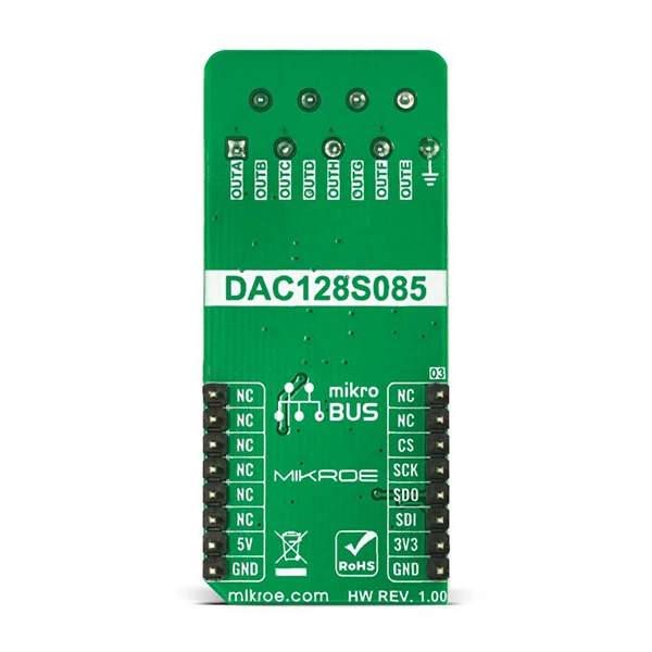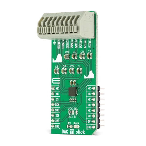 DAC 11 Click as its foundation uses the DAC128S085, a general-purpose 12-bit 8-channel digital-to-analog converter (DAC) from Texas Instruments. The DAC128S085 is fabricated on a CMOS process with an architecture that consists of switches and resistor strings followed by an output buffer. It ensures monotonicity, low power consumption of 4.85mW at 5V, individual channel power-down capability, and has high precision output amplifier that allows rail-to-rail output swing over a wide supply voltage range.