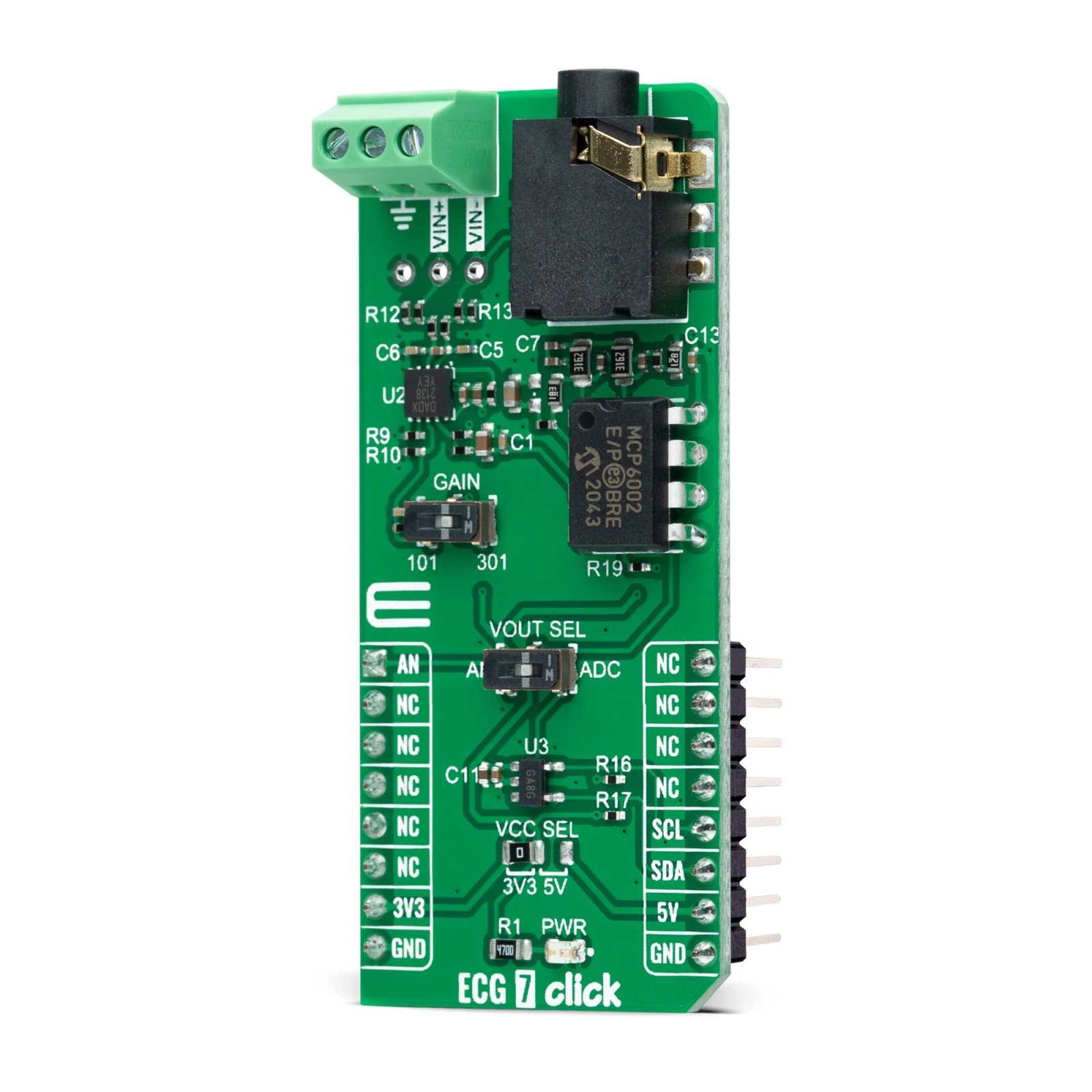 ECG 7 Click is a compact add-on board that records the heart’s electrical activity. This board features the MCP6N16, a single zero-drift instrumentation amplifier with selectable gain from Microchip. In addition to the jack connector provided for connecting the cable with ECG electrodes, this Click board™ offers the possibility of connecting electrodes through screw terminals or an onboard header if the electrode connection does not match the jack connector. Besides, the user is allowed to process the output signal in analog or digital form. This Click board™ is suitable for medical remote diagnostic equipment applications, such as electrocardiogram (ECG) measurement.