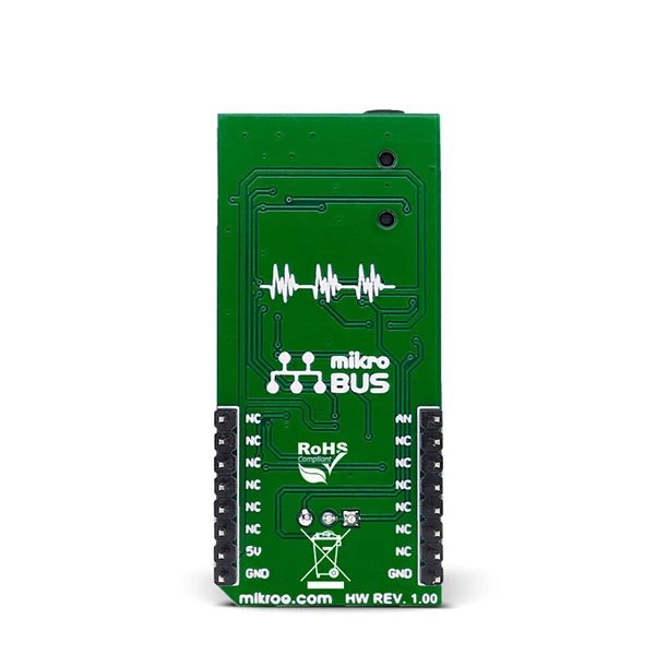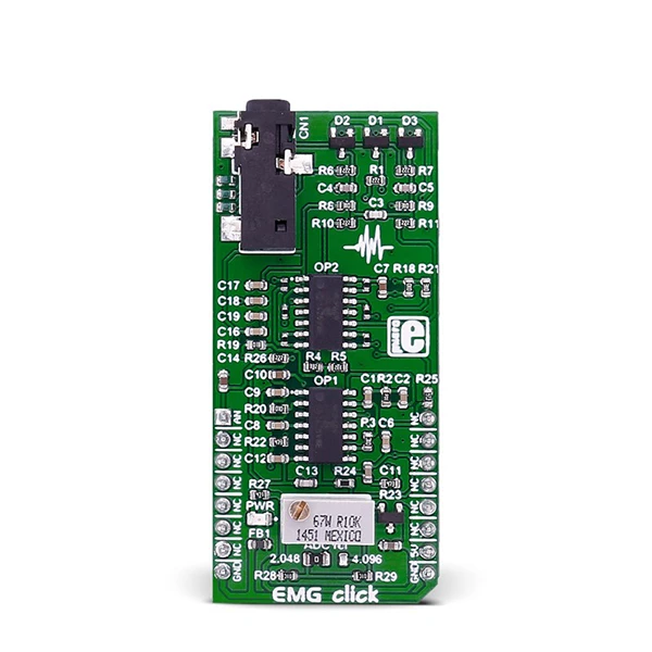 EMG Click measures the electrical activity produced by the skeletal muscles. It carries MCP609 operational amplifier and MAX6106 micropower voltage reference. EMG Click is designed to run on a 5V power supply. The Click board™ has an analog output (AN pin).