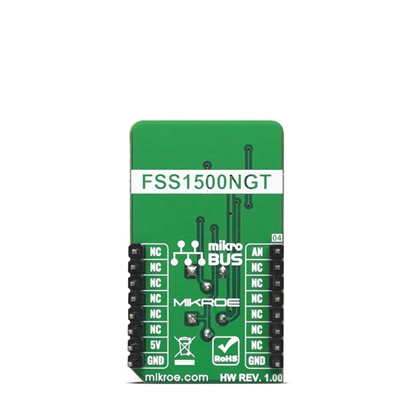 Force 2 Click is a mikroBUS™ add-on board with circuitry for implementing Honeywell’s FSS1500NGT Series force sensors into your projects (with a single zone force sensing resistor included with the Click). This Click board™ utilizes FSS1500NGT force sensor which is designed to be one of the most reliable force sensor available as illustrated by 20 million Mean Cycles to Failure (MCTF) at 25 °C [77 °F] rating. This low profile Surface Mount Technology (SMT) sensor allows for automated assembly on a printed circuit board, often helping the customer to reduce assembly costs, while maintainging precise and reliable force sensing performance in a compact commercial-grade package.
