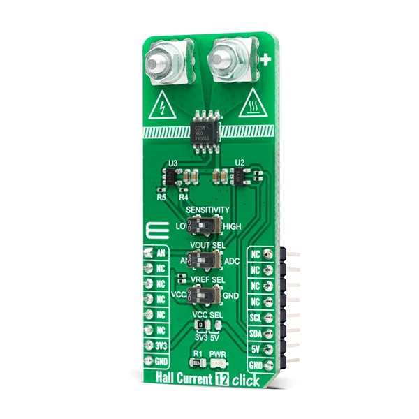 Hall Current 12 Click as its foundation uses the TMCS1100A4, a precision Hall-effect current sensor, featuring a 600V isolation working voltage, <1% full-scale error across temperature, and a reference voltage enabling unidirectional or bidirectional current sensing from Texas Instruments. The input current flows through an internal 1.8mΩ conductor that generates a magnetic field measured by an integrated Hall-effect sensor and amplified by a precision signal chain. The device has a bandwidth of 80kHz and can be used for both AC and DC current measurements. It is optimized for high accuracy and temperature stability, with offset and sensitivity compensated across the operating temperature range.