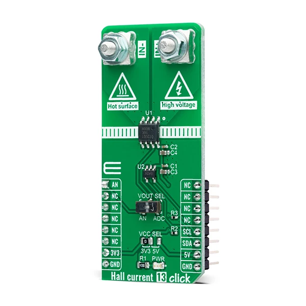 This Click board™ possesses two ways to communicate with the MCU. The analog output signal of the TMCS1107-Q1 can be converted to a digital value using MCP3221, a successive approximation A/D converter with a 12-bit resolution from Microchip using a 2-wire I2C compatible interface, or can be sent directly to an analog pin of the mikroBUS™ socket labeled as AN. Selection can be performed by onboard SMD switch labeled as VOUT SEL, setting it to an appropriate position marked as AN and ADC.