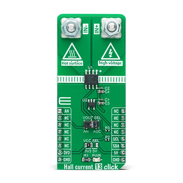 Hall Current 13 Click is a compact add-on board that provides economical and precise AC or DC current sensing solutions. This board features the TMCS1107-Q1, a galvanically isolated Hall-effect current sensor capable of DC or AC current measurement with high accuracy, excellent linearity, and temperature stability from Texas Instruments. It enables the lowest drift, <3% full-scale error, and highest accuracy over time and temperature. It also provides a reliable 420V lifetime working voltage and 3kVRMS isolation between the current path and circuitry with uni/bidirectional current sensing. Besides, the user is allowed to process the output signal in analog or digital form. This Click board™ is suitable for AC or DC current-sensing in industrial and commercial systems, motor and load control, power factor correction, overcurrent protection, and many more.