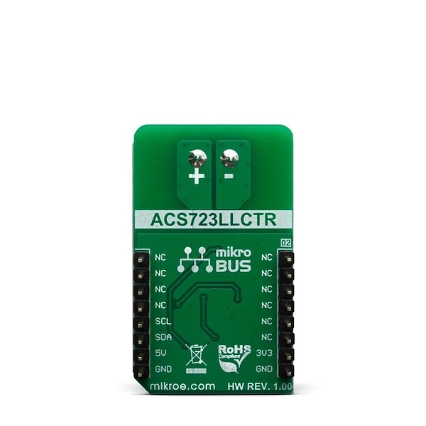 Hall Current 6 utilizes the ACS723(LLCTR-05AB-T), a high-accuracy, galvanically isolated current sensor IC, from Allegro Microsystems. This sensor utilizes the Hall effect phenomenon to measure the current passing through the internally fused input pins of the IC. This allows the series resistance to stay very low. Current through the input rails of the IC generates a magnetic field, causing the Hall effect on the current through the integrated sensor. These two current circuits are completely isolated, with the basic isolation working voltage of about 297VRMS, allowing the Click board™ to be used in high-side current sensing applications.