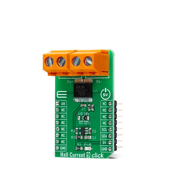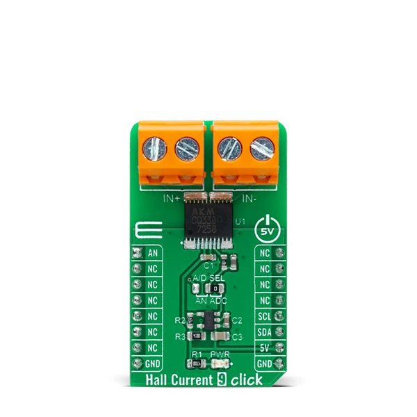 Hall Current 9 Click is a compact add-on board that provides a fast and precise solution for AC / DC current sensing. This board features the CQ3300, a high-speed response coreless current sensor using a Hall sensor that outputs the analog voltage proportional to the AC/DC from AKM Semiconductor. It employs a high sensitive InAs (Indium Arsenide) Hall element with the ability to detect both DC and AC with high accuracy and high speed. It has an ultra-fast high response of 0.5μsec, high galvanic isolation, and it is designed for the currents to range from -6.4A to +6.4A. This Click board™ is suitable for overcurrent applications and shows good performance in small-sized inverter applications.