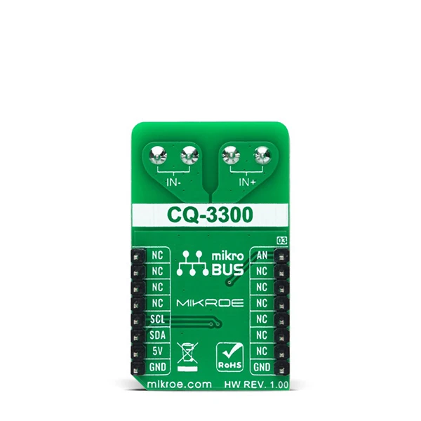 The CQ3300 has a ratiometric output that means it changes proportionally to the supply voltage. It is suitable for applications where the analog output is converted to digital using an A/D converter and where fluctuation of the power supply voltage causes reference error of the A/D converter. Just like that, the output voltage can be converted to a digital value using MCP3221, a successive approximation A/D converter with a 12-bit resolution from Microchip, using a 2-wire I2C compatible interface, or can be sent directly to an analog pin of the mikroBUS™ socket labeled as AN. Selection can be performed by onboard SMD jumper labeled as A/D SEL to an appropriate position marked as AN and ADC.
