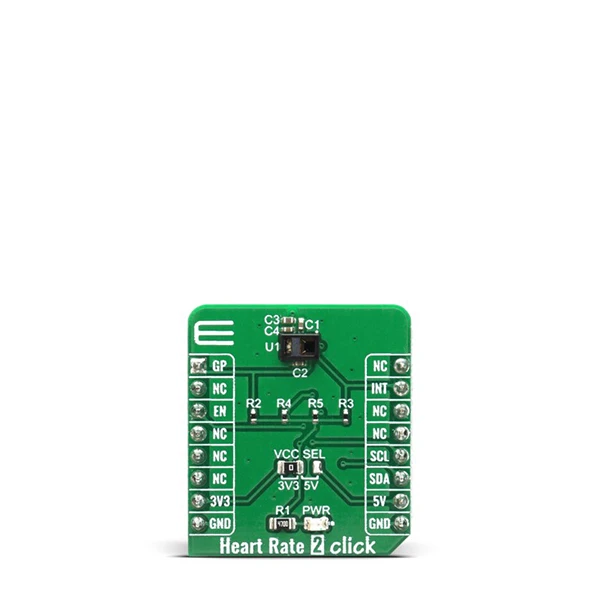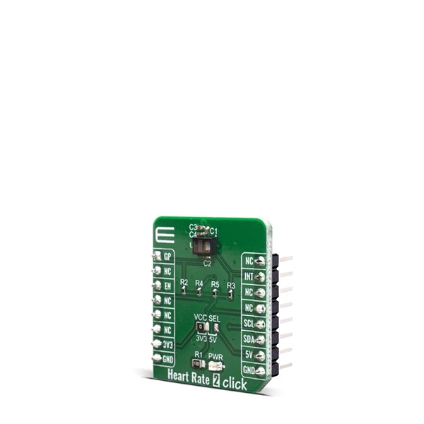 Heart Rate 2 Click is an add-on board based on MAXM86161 from Analog Devices a complete, integrated, optical data acquisition system, ideal for optical pulse oximetry and heart-rate detection applications. The optical readout has a low-noise signal conditioning analog front-end (AFE), including 19-bit ADC, an industry-lead ambient light cancellation (ALC) circuit, and a picket fence detect and replace algorithm. It also includes high-resolution optical readout signal processing channels with robust ambient light cancellation and high-current LED driver DACs to form a complete optical readout signal chain.