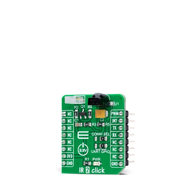 IR 2 Click is a compact add-on board representing a compact and easy solution for adding infrared (IR) remote control to your design. This board features the TSMP58138, a miniaturized sensor for receiving the modulated signal of QEE113 IR emitting diode from Vishay Semiconductors. This IR sensor module consists of a photodetector, pre-amplifier, and automatic gain control to surpass ambient noise with signals transmitted to it in the near-infrared range with a wavelength of 940nm. It also communicates with the target MCU via selectable GPIO lines. This Click board™ is suitable for IR repeater applications that improve your system and allow you more flexibility, sensitivity, and longer receiving range.