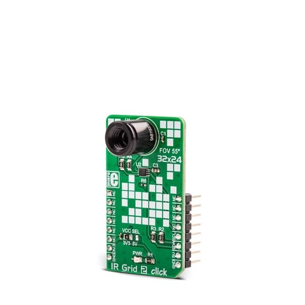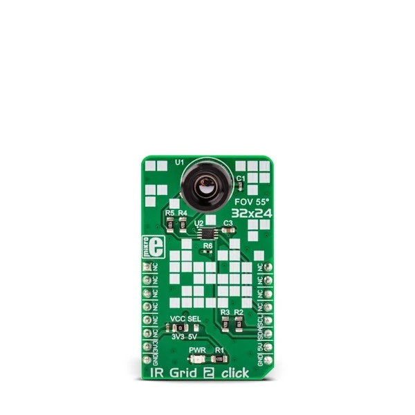 IR Grid 2 Click is a thermal imaging sensor. It has an array of 768 very sensitive factory calibrated IR elements (pixels), arranged in 32 rows of 24 pixels. Each one of them is measuring an object temperature up to 300˚C within its local Field of View (FOV). The MLX90640ESF-BAB IR sensor used on this Click board™ has just four pins, and it is mounted inside of the industry standard TO39 package. It is equipped with 2Kbit of EEPROM for storing the compensation and calibration parameters. The MLX90640ESF-BAB IR sensor array IC has I2C compatible digital interface, allowing it to be interfaced with a wide range of different MCUs. The sensor used on this Click board™ offers a summed field of view of 55˚x32˚. The sensor can output up to 64 frames per second (FPS).
