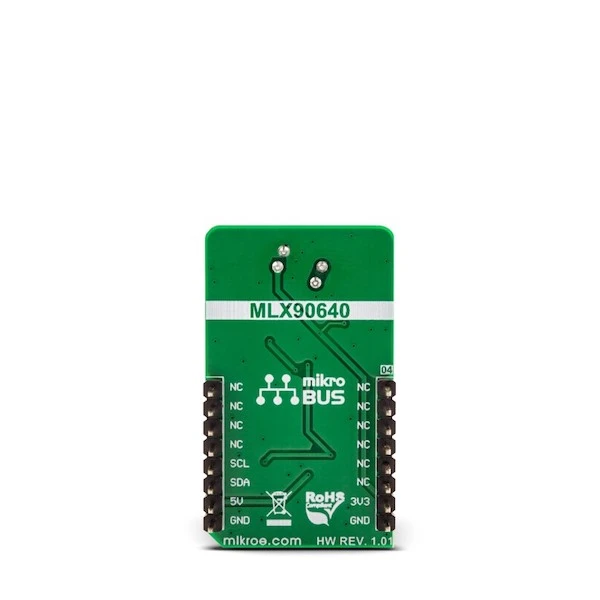 It should be noted that the sensor measures the IR emissivity of an object, so it is to be expected that some materials cannot be accurately measured by this sensor due to their low emissivity, such as the aluminum. To better understand the emissivity property of the materials, a person wearing clothes, can be taken as an example: the measured temperature will reflect the clothes temperature, rather than the body temperature itself, which is known to be about 37 ˚C Care should be taken not to expose the Click board™ to a cold or hot air flow, as it will cause false readings of the real temperature. This sensor requires the temperature across the sensor package to be constant.