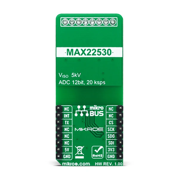 The MAX22530 communicates with MCU using the standard SPI serial interface with a maximum frequency of 10MHz. Besides, it continuously monitors multiple possible fault conditions such as ADC functionality error, SPI framing error, CRC errors from SPI communications, and internal isolated data stream loss. This hardware alert feature is provided through the interrupt pin, routed on the CS pin of the mikroBUS™ socket, which asserts low when an enabled fault is detected.