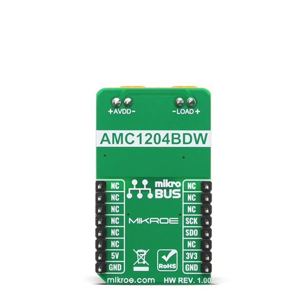 The Click board™ communicates with the target microcontroller over SPI interface on the mikroBUS™ line. The analog input range is tailored to directly accommodate the voltage drop across a shunt resistor used for current sensing. The SiO2 -based capacitive isolation barrier supports a high level of magnetic field immunity as described in the Digital Isolator Magnetic-Field Immunity application report. The external clock input simplifies the synchronization of multiple current sense channels on system level. The extended frequency range of up to 20 MHz and is provided externally at the CLKIN pin. The data are synchronously provided at 20 MHz at the DATA output pin. The data are changing at the falling edge of CLKIN.