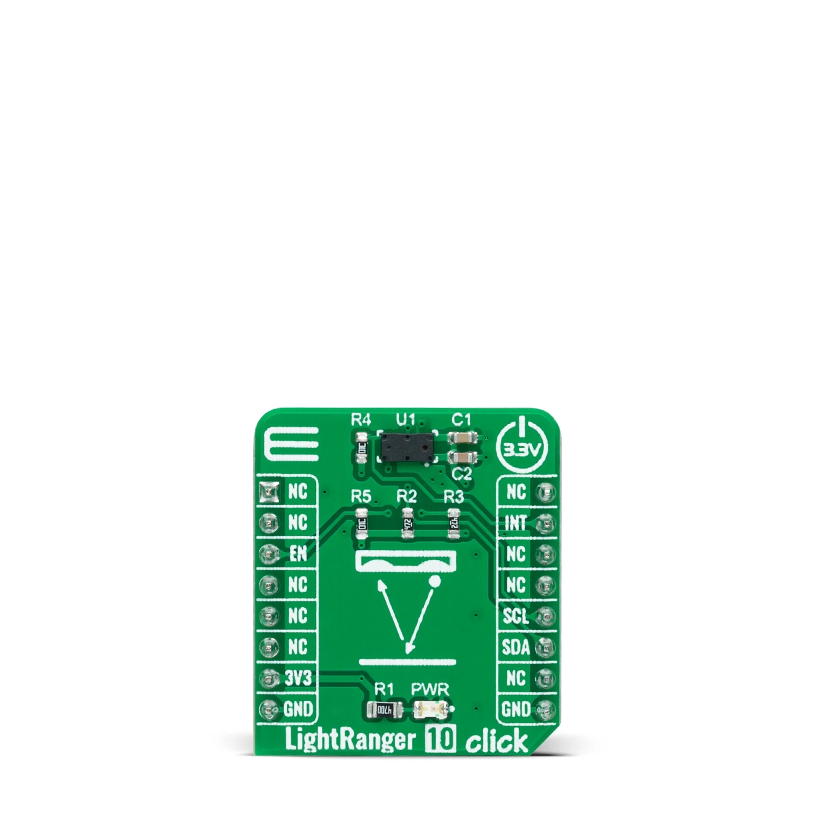LightRanger 10 Click as its foundation uses the VL53L4CX, a ToF (Time-of-Flight) optical distance sensor with an extended target detection range from STMicroelectronics. This ToF sensor integrates a VCSEL (vertical-cavity surface-emitting laser), which emits an entirely invisible 940nm IR light, totally safe for eyes (Class 1 certification), and a SPAD (single-photon avalanche diode) array which helps the VL53L4CX to achieve the best ranging performance even when a Click board™ is hidden behind a wide range of cover glass materials.
