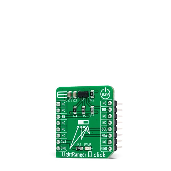 LightRanger 8 Click communicates with MCU using the standard I2C 2-Wire interface, with a clock frequency up to 400kHz in the Fast and 1MHz in the Fast Mode Plus. Also, it provides the possibility of the device Power-Up/Boot and interrupt feature routed to the INT pin of the mikroBUS™ socket to optimize ranging operation.