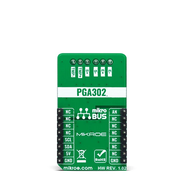 Load Cell 3 Click is a compact add-on board that represents a weigh scale solution. This board features the PGA302, a low-drift, low-noise, programmable signal-conditioner device designed for various resistive bridge-sensing applications from Texas Instruments. It creates 2.5V of bridge excitation and a current output source with programmable current output up to 1mA. Two identical analog front-end (AFE) channels followed by a 16-bit Sigma-Delta ADC are available at the input, where each AFE channel has a dedicated programmable gain amplifier with gain up to 200V/V. It also comes with an on-chip temperature sensor and integrated EEPROM memory for device configuration, calibration, and user data. This Click board™ has many features that make it a perfect solution for weight scale and force-sensing applications that use strain gauge load cells and other general resistive bridge signal-conditioning applications.