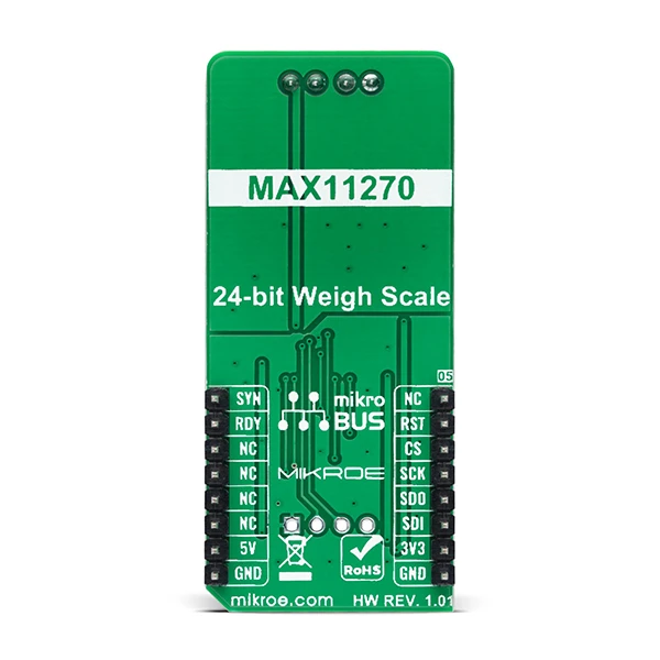 Load Cell 6 Click is a compact add-on board representing a weigh scale solution. This board features the MAX11270, a high-performance 24-bit delta-sigma ADC that achieves excellent 130dB SNR while dissipating an ultra-low 10mW from Analog Devices. This SPI-configurable ADC sample rates up to 64ksps allow precision DC and AC measurements, with integral non-linearity guaranteed to 4ppm maximum. The MAX11270 offers a 6.5nV/√Hz noise programmable gain amplifier with gain settings between 1x to 128x. Optional buffers are also included to isolate the signal inputs from the switched capacitor sampling network, which allows the MAX11270 to be used with high-impedance sources without compromising the available dynamic range. This Click board™ is suitable for weight scale applications in various use cases.