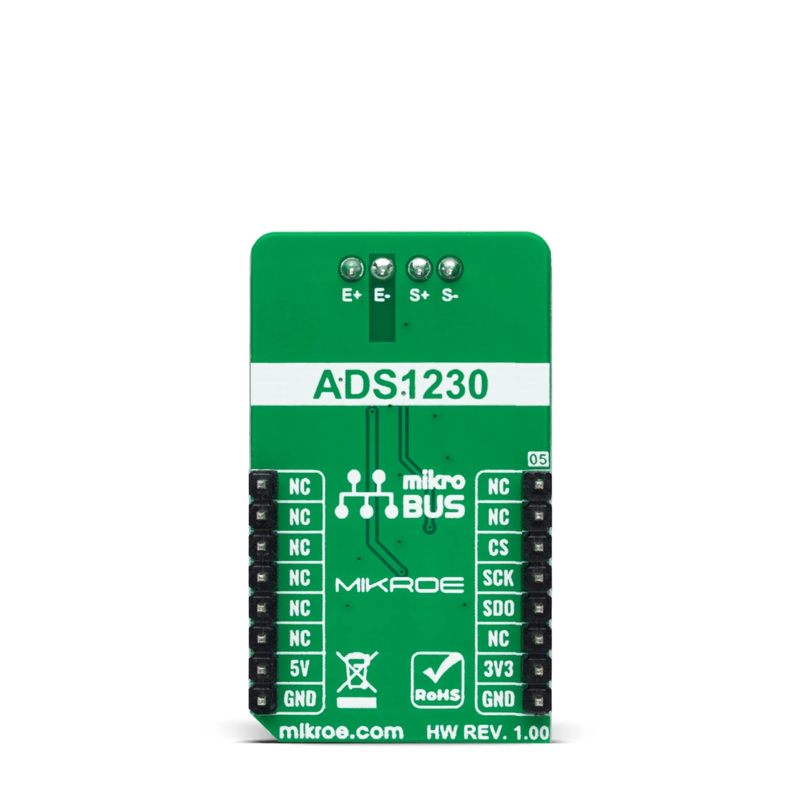 Load Cell 7 Click as its foundation uses the ADS1230, a high accuracy, low noise, and low power 20-bit ΣΔ ADC with an outstanding noise performance from Texas Instruments. It includes a low-noise PGA, internal oscillator, third-order delta-sigma (ΔΣ) modulator, and fourth-order digital filter, thus providing a complete front-end solution for bridge sensor applications. The ADS1230 is easy to configure, and all digital control is accomplished through dedicated pins; there are no registers to program. The conversions from the ADS1230 are sent to the MCU through SPI serial interface, with the digital information converted to weight.