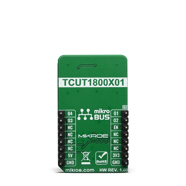 Opto Encoder 3 Click is a linear incremental optical sensor/encoder Click, which can be used for the movement or rotation encoding. The TCUT1800X01 sensor is equipped with one infrared LED with the wavelength of 950nm, and four phototransistors. Encoders of this type are widely used for many applications which involve precise detection of the position, speed, or rotational angle of an object. Rotary encoders are often used for various types of controllers on many different devices. Whether it be a rotary encoded knob controller or a rotation encoder on a motor shaft, the principle is the same – it includes an optical sensor, just like the one found on Opto Encoder 3 Click.
