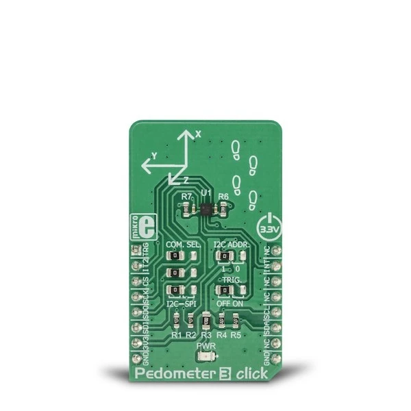 Featuring the KX126-1063 IC, based on the advanced ASIC and reliable MEMS, produced using proprietary Kionix manufacturing technology, this Click board™ is a perfect choice for development of fitness-related applications, which rely on functionalities that Pedometer 3 Click has to offer: an advanced hardware pedometer functionality with programmable sensing thresholds for the step detection, the Directional Tap/Double-Tap™ detection, the advanced orientation detection, the freefall detection, the tilt detection with the 8-bit timer, and the motion monitoring functionality, including wake-up on motion with programmable thresholds.