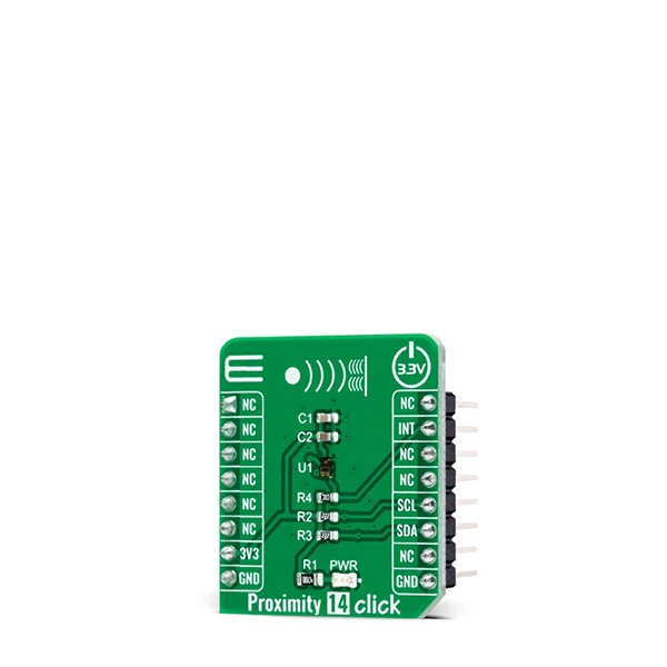 Proximity 14 Click as its foundation uses the VCNL36825T, a new fully integrated proximity sensor designed to increase efficiency and performance in consumer and industrial applications from Vishay Semiconductors. Featuring a vertical-cavity surface-emitting laser (VCSEL), the VCNL36825T combines a photodiode, signal processing IC, and 12-bit ADC in a compact SMD package, with a small 1.6mm light hole. With a range of 20cm, it also provides collision detection and features low power consumption down to 6.63µA to increase efficiency in these applications.