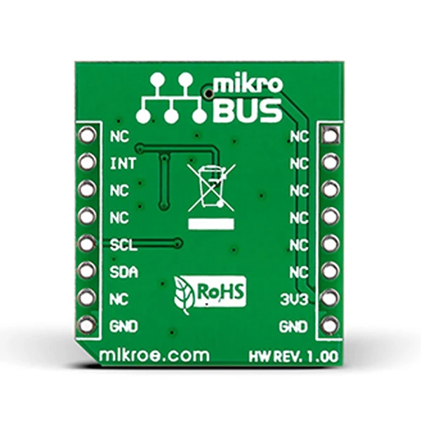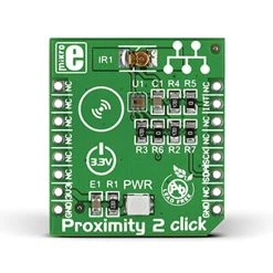 Proximity 2 Click features MAX44000, an IC that integrates an ambient light as well as a proximity sensor. The chip consists of an array of photodiodes that convert light into current, which the internal circuitry then converts into a digital value. The light sensor has a dynamic range of 0.03 to 65.535 lux. The IR proximity detector is matched with an integrated IR LED driver (for the onboard high power infrared LED). Proximity 2 Click communicates with the target board microcontroller through mikroBUS I2C (SCL, SDA), and INT lines. It’s designed to use a 3.3V power supply only.