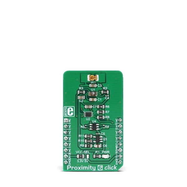 Proximity 6 Click is a versatile proximity detection device on a Click board™. It can detect a foreign object distanced up to 20cm. The Click board™ features a detection sensor IC that can trigger a threshold based interrupts, which makes this Click board™ capable of detecting even simple gesture movements. The advanced onboard IC sensor features LED driver section, a light sensor with the integrated analog front end (AFE), 14 bit analog to digital converter (ADC), and digital engine for processing and aggregation of the measurement result, which simplifies the firmware development. The ambient light cancellation includes both digital and optical filtering, resulting in increased detection reliability.