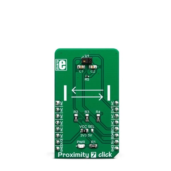 Proximity 7 Click uses an I2C interface to communicate with the host MCU. It is equipped with a SMD jumper labeled as VCC SEL. This jumper is used to select the power supply for the pull-up resistors on the I2C bus, allowing both 3.3V and 5V MCUs to be interfaced with this Click board™.
