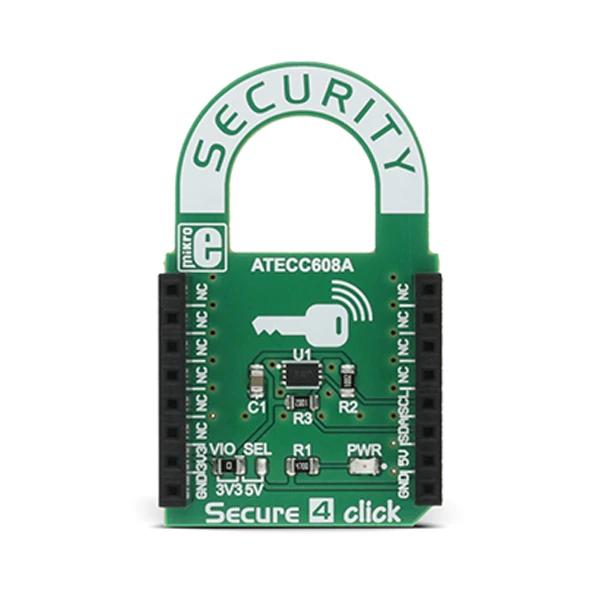 Secure 4 Click includes the ATECC608A, a secure CryptoAuthentication™ device from Microchip, which is equipped with an EEPROM array which can be used for storing of up to 16 keys, certificates, consumption logging, security configurations and other types of secure data. Access to the various sections of memory can be restricted in several different ways and then the configuration can be locked permanently, to prevent changes.