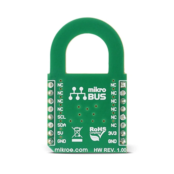 The chip itself uses a minimal number of pins; only the I2C lines are routed to the mikroBUS™ along with the 3.3V and 5V rails. The device can work with any of these voltages. It can be selected by soldering a small SMD jumper to the correct position.