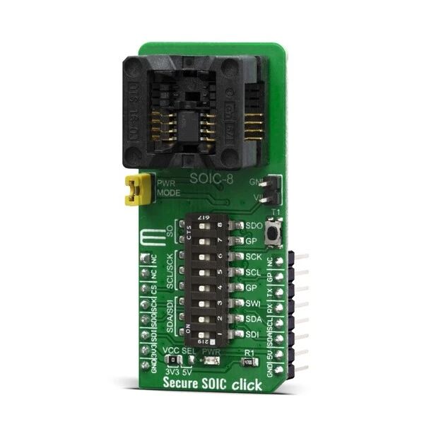 Secure SOIC Click is universal, socket based Click board™, specifically designed for the Microchip CryptoAuthentication™ devices in an 8-pin SOIC package. This Click board™ supports the SPI, I2C, and the SWI interface based ICs from the CryptoAuthentication™ family with a flexible command set, that allows use in various security applications, including Network/IoT Node Endpoint Security, Secure Boot, Small Message Encryption, Key Generation for Software Download, Ecosystem control, Anti Counterfeiting and similar.