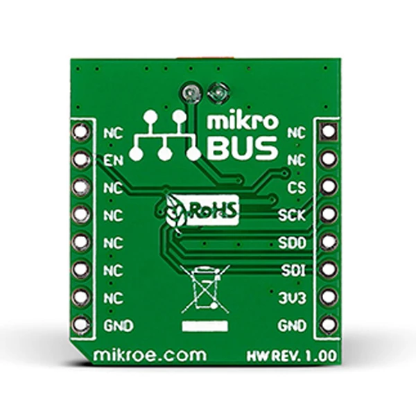 Shake2Wake Click carries an ADXL362 ultralow power, 3-axis MEMS accelerometer and ADP195 the load switch which provides power domain isolation, both of them manufactured by Analog Devices. The distinguishing feature of this IC is that it incorporates several activity detection modes. The interrupt pins from the chip are connected to an onboard ADP195 power switch IC that in turn controls an external device connected through a screw terminal. The detection threshold is configurable (both intensity and duration). The duration of inactivity that leads to switching off is also programmable. Shake2Wake Click can also be used as a regular accelerometer, for continuous sensing, in which case it communicates with the target MCU through mikroBUS SPI interface. Uses 3.3V power supply only.