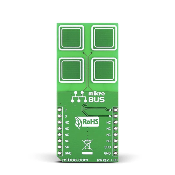 MIKROE Touchkey Click has four capacitive pads powered by TTP224, a touchpad detector IC. Capacitive buttons like these can be toggled even when placed under a layer of glass or paper. The board outputs an interrupt signals for each pad: OUTA, OUTB, OUTC and OUTD (in place of default mikroBUS™ RST, AN, PWM and INT pins, respectively). The TTP224 IC has several operating modes which are accessed through onboard jumpers. Modes include Fast or low power (the response time is just 100mS at fast mode and 200mS at low power). Single-key or multi-key, direct or toggle buttons, and so on.