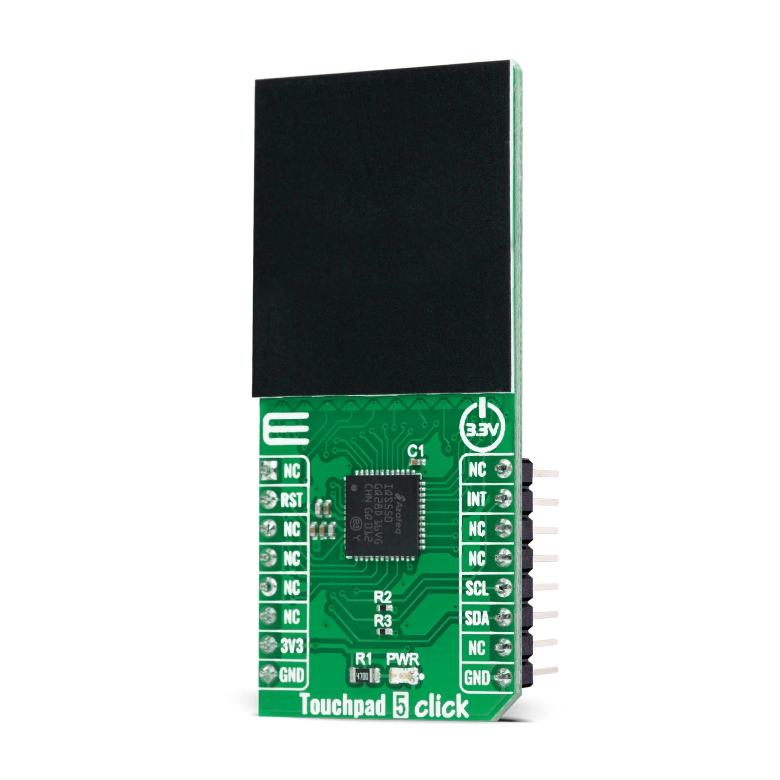Touchpad 5 Click as its foundation uses the IQS550, a projected capacitive touch and proximity trackpad/touchscreen controller from Azoteq. The IQS550 offers high sensitivity proximity wake-up and contact detection (touch) through many I2C-controllable sensor lines. Its advanced on-chip signal processing capabilities provide stable high performance with high sensitivity. Also, multiple filters are implemented to detect and suppress noise, track slow varying environmental conditions, and avoid the effects of possible drift. The IQS550 controller is very flexible, providing numerous outputs such as proximity, touch, snap, touch strength, area, and actual finger position, all in one solution.