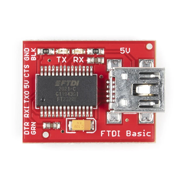 The SparkFun 5V FTDI Starter Kit gives you just what you need to get started with FTDI FT232RL USB to serial IC. The pinout of the included board matches the FTDI cable standard to work with official Arduino and cloned 5V Arduino boards. It can also be used for general serial applications. The major difference with this board is that it brings out the DTR pin as opposed to the RTS pin of the FTDI cable. The DTR pin allows an Arduino target to auto-reset when a new Sketch is downloaded. This is a really nice feature to have and allows a sketch to be downloaded without having to hit the reset button. This board will auto reset any Arduino board that has the reset pin brought out to a 6-pin connector.