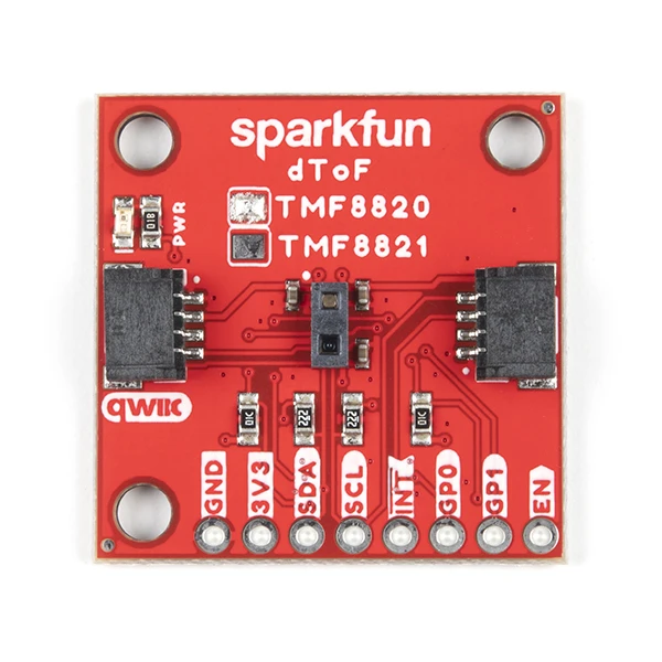 To make it even easier to get your readings, all communication is enacted exclusively via I2C, utilizing our handy Qwiic system so no soldering is required to connect it to the rest of your system. However, we still have broken out 0.1”-spaced pins in case you prefer to use a breadboard. The TMF8820 offers two configurable GPIO pins and one enable (EN) pin, which are broken out as PTH pads. The board also includes a power LED and I2C pull-up resistors, each configurable via jumpers. This version has a footprint that uses the Qwiic Standard size (1.0in. x 1.0in.). For a smaller footprint, check out our Qwiic Mini dToF TMF8820 Imager board!