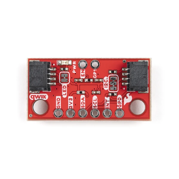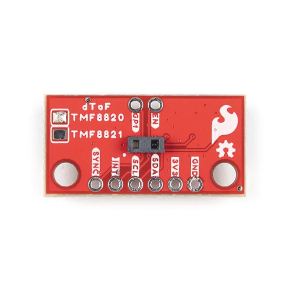 To make it even easier to get your readings, all communication is enacted exclusively via I2C, utilizing our handy Qwiic system so no soldering is required to connect it to the rest of your system. However, we still have broken out 0.1”-spaced pins in case you prefer to use a breadboard. The TMF8820 offers two configurable GPIO pins and one enable (EN) pin, which are broken out as PTH pads. The board also includes a power LED and I2C pull-up resistors, each configurable via jumpers. This Mini version has a footprint that is half the size (0.5in. x 1.0in.) of our standard Qwiic Mini dToF TMF8820 Imager board. Additionally, we moved the Qwiic connectors to the back of the board. These design changes favor mounting applications where the TMF8820 sensor faces outward from an enclosure or chassis, and keeps your Qwiic cables cleanly tucked away.