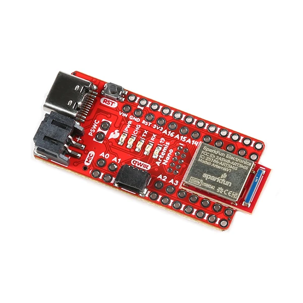 Along with the Speaker Amp, you will get the RedBoard Artemis Nano as your Arduino microcontroller. The RedBoard Artemis Nano is a minimal but extremely handy implementation of the Artemis module. A lightweight, 0.8mm thick PCB, with onboard LiPo-battery charging and a Qwiic connector, this board is easy to implement into very small projects. A dual row of ground connections makes it easy to add lots of buttons, LEDs, and anything that requires its own GND connection. At the same time, the board is breadboard compatible if you solder the inner rows of pins.