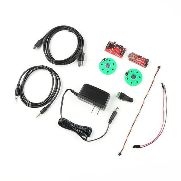 The SparkFun Qwiic Speaker Kit provides you with just what you need to get started with stereo audio via a simple Qwiic interface! Included in this kit, you will find two thin speakers, all connecting cables (that includes power and Qwiic), a wall adapter, as well as a SparkFun Qwiic Speaker Amp and RedBoard Artemis Nano. Thanks to the kit being Qwiic-enabled, no soldering is required, either!